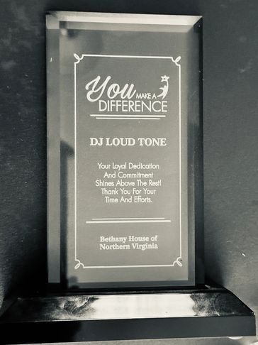 In 2023, DJ LOUD TONE received the “You Make a Difference” award from Bethany House of Northern Virginia. The honor recognized his dedication to supporting nonprofits through volunteering and donated entertainment services—using music to uplift communities and help organizations achieve their mission.